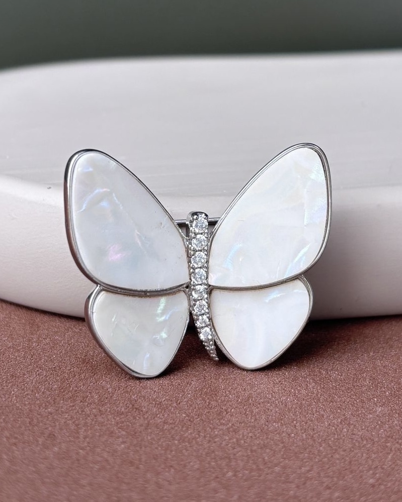 Este broche em formato de borboleta é confeccionado em madrepérola, material que reflete a luz com um brilho suave e elegante.